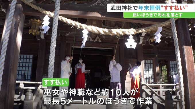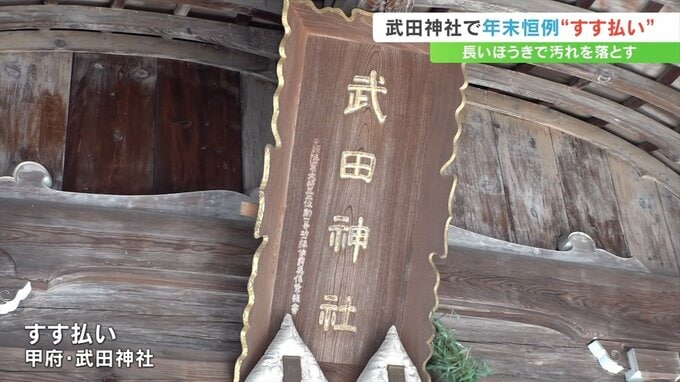 甲府市の武田神社で年末恒例のすす払いが行われ、神職や巫女が長いほうきを使って今年1年のほこりを払い落しました。