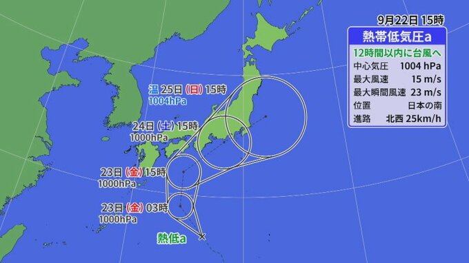 熱帯低気圧は日本の南の海上に位置していて、今後、発達しながら北上し23日の昼ごろまでに台風へ変わる見込みです。