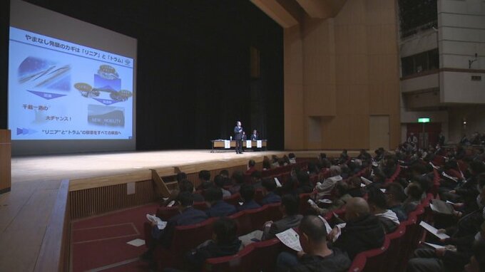 山梨県が発表した「富士トラム」とリニア新駅を結ぶ新たな構想についての意見交換会が甲府市で開かれました。