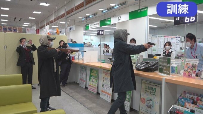 訓練は猟銃と拳銃を持った2人組の男が銀行に押し入って従業員を脅して現金を奪い車で逃走する想定で行われました。
