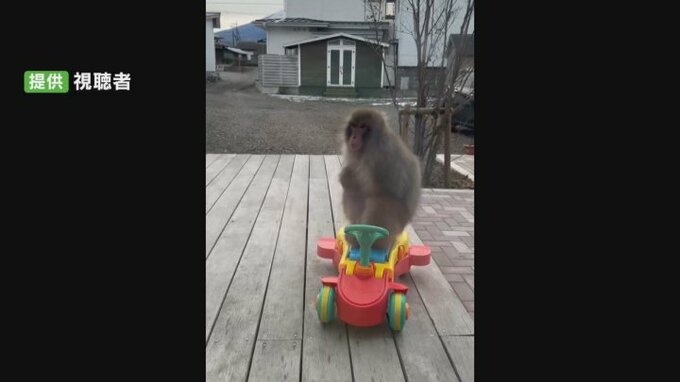 子ども用のおもちゃの車に乗り、あたりを見回しているのはサルです。