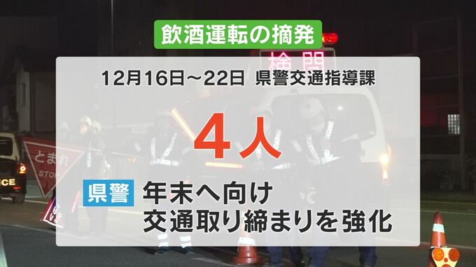飲酒運転 1週間で4人を摘発 年末は取り締まり強化 山梨県警 2024年12月23日(月) 19:00 国内 山梨県警は22日までの1週間で4人を飲酒運転で摘発しました。 県警交通指導課によりますと、今月16日からの1週間に飲酒運転により4人を摘発しました。 年末は忘年会などで酒を飲む機会が増えることから県警は取り締まりを強化しています。