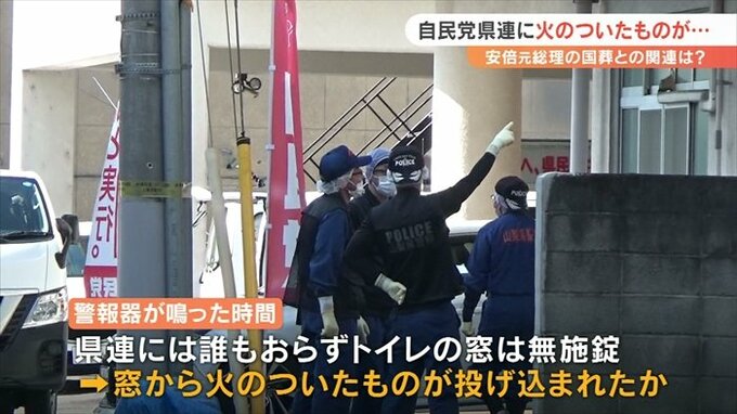 県連関係者によりますと、警報器が鳴った時間帯は県連には誰もいませんでしたが、トイレの窓のカギはかかっていなかったということで、トイレの窓から火のついたものが投げ込まれたとみられています。