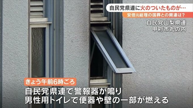 26日午前6時ごろ、甲府市丸の内の自民党山梨県連で警報機が鳴り、建物北側にある男性用トイレの便器や壁の一部に燃えたような跡があるのが見つかりました。