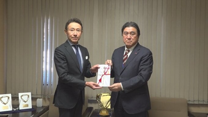 24日は印傳屋上原勇七の専務 上原伊三男さんがUTY本社を訪れ、テレビ山梨厚生文化事業団に目録を手渡しました。
