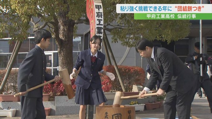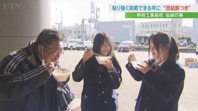 甲府工業高校で伝統の餅つきが行われ、つきたての餅が生徒に振る舞われました。