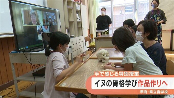 犬の骨格を学び、作品作りに活かそうという授業が山梨県立盲学校で行われました。