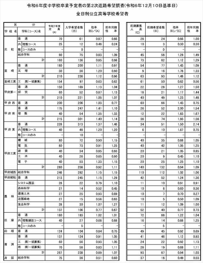 【全校掲載】全日制公立高校の全体の倍率は0.97倍 過去最低を更新 高校入試の第2次進路希望調査 山梨県