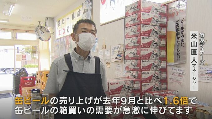 缶ビールの売り上げが去年9月と比べ1.6倍で、缶ビールの箱買いの需要が急激に伸びてますね。