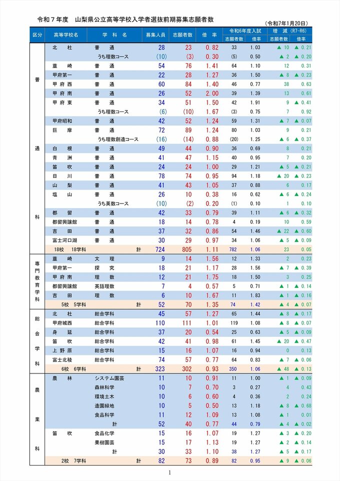 最高は甲府南の普通科で2.00倍 山梨県公立高校入試の前期試験 全体の倍率は1.02倍