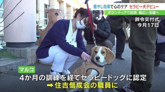 マルコは4か月の訓練を経て1月、セラピードッグに認定され、甲府市の住吉病院などを運営する住吉偕成会の職員として働いています。