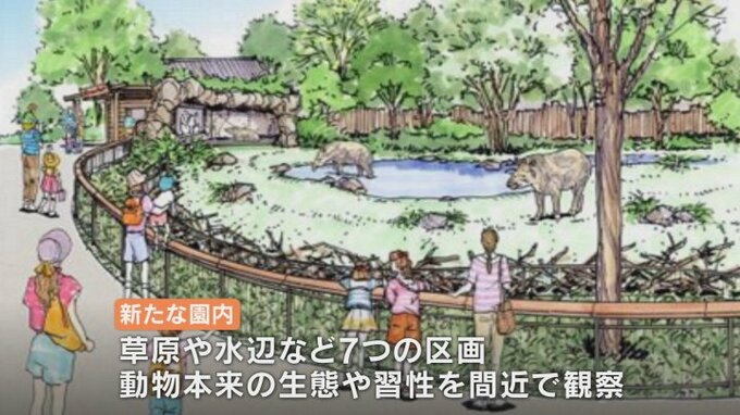 新たな園内は草原や水辺など7つの区画に分けて動物本来の生態や習性を間近で観察できるようになるということです。