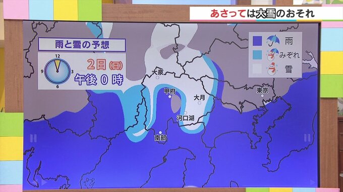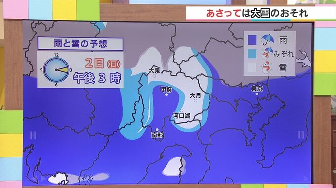 現時点の悪目の予想ですと、2日午前3時の段階で、山梨県の中北や峡南の一部で雪雲がかかっている予想となっています。