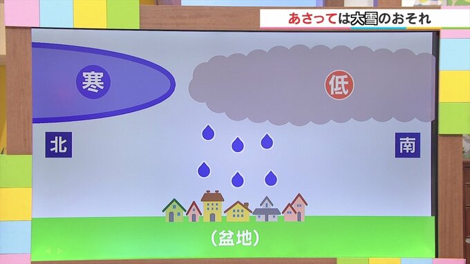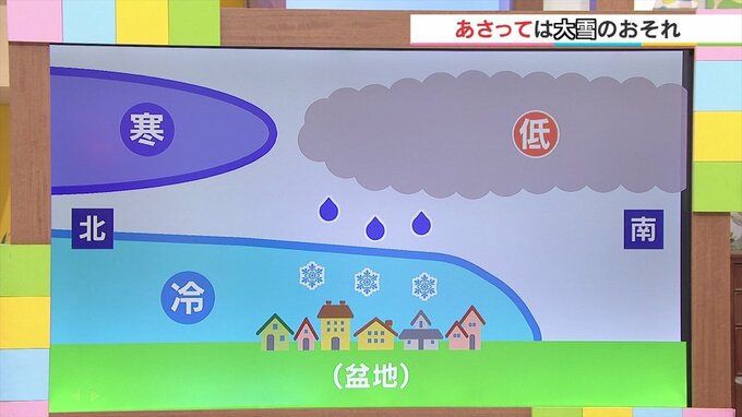 左の方はこれ北の方向を表していまして、これ右の方は南の方、つまり南から低気圧が近づいて、この寒気と重なると、盆地では降ってくるのは気温が低いので雪となるシナリオなんです。