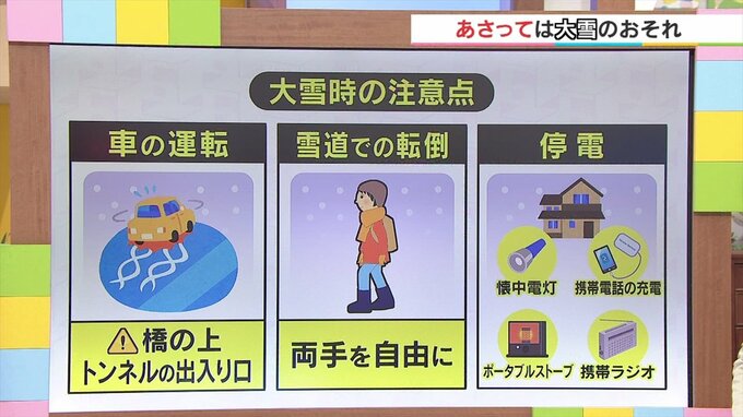 そして、停電、雪による重みで電線が切れるおそれもありますから、モバイルバッテリーの充電や電気がなくても使えるポータブルストーブの準備。
