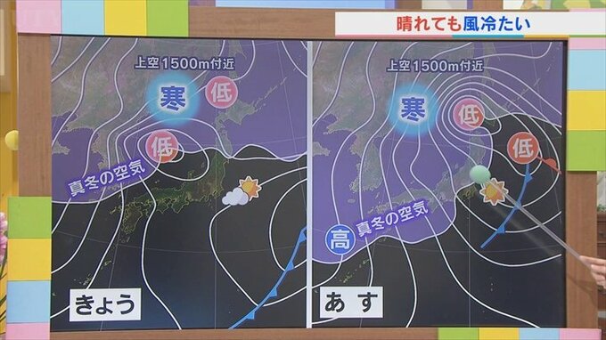ですから洗濯物は朝から外干しで問題ないと見ていますが、上空の冷たい空気=寒気を重ねてみますと北からグーッと南下してくることになりますから、きょうは雲が広がって寒かった。あすは晴れても寒いというのがポイントとなります。