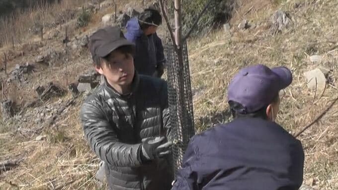 15日はコーリングの従業員やボランティアらおよそ30人が、高さ3mほどに育ったソメイヨシノおよそ100本を山の斜面に植えていきました。