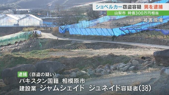 警察によりますとジャムシェイド容疑者は、去年2月13日から翌日にかけて、山梨市南にある資材置き場からショベルカー1台、時価300万円相当を盗んだ疑いがもたれています。
