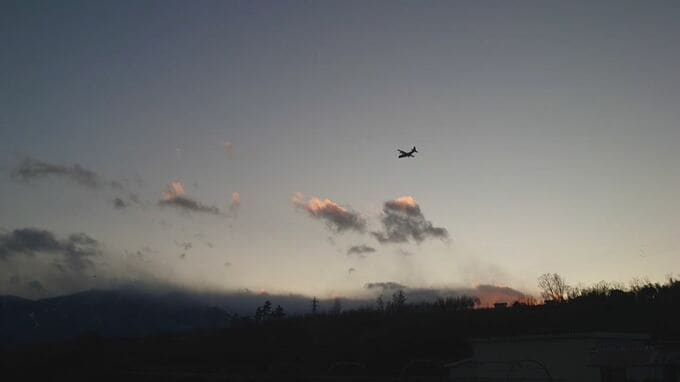 空が薄暗くなり始めたころ、響き渡るエンジン音とともに航空機が低い高度で飛んでいる様子が撮影されています。
