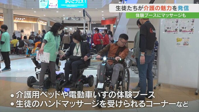 また介護用ベッドや電動車いすの体験ブースや専門学校の生徒のハンドマッサージを受けられるコーナーもあり、多くの買い物客が足を止めていました。