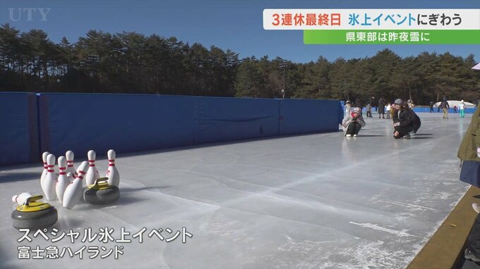 23日夜、山梨県内の一部で雪が降り、雪から一夜明けたきょう24日富士急ハイランドではカーリングやアイスホッケーが体験できるイベントが開かれ、大勢の親子が参加しました。