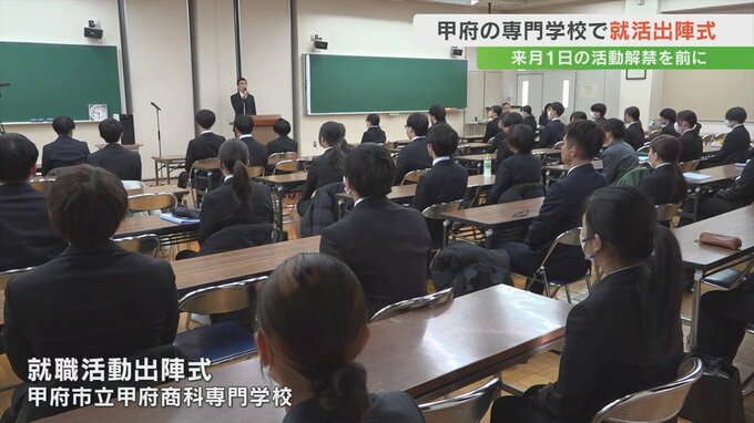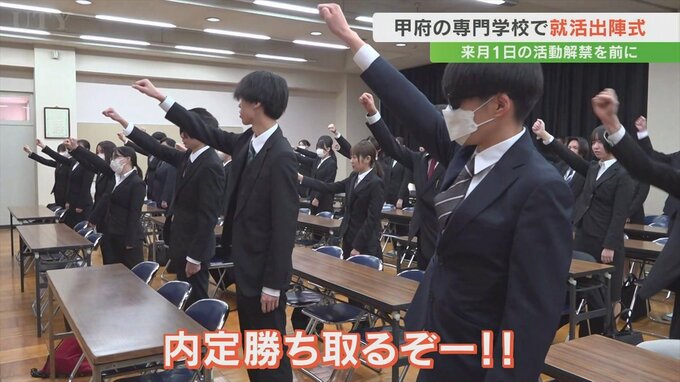 3月1日の就職活動解禁を前に、甲府市内の専門学校で就職内定を目指して出陣式が行われました。