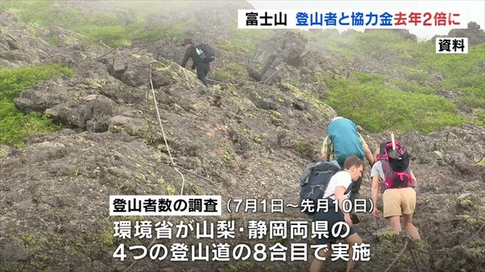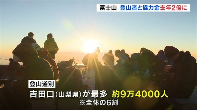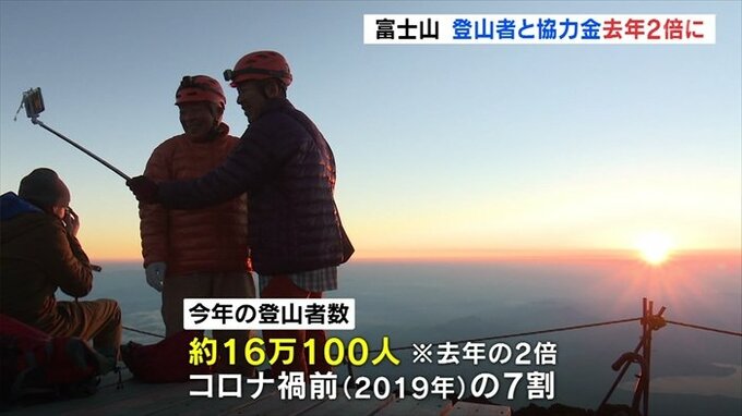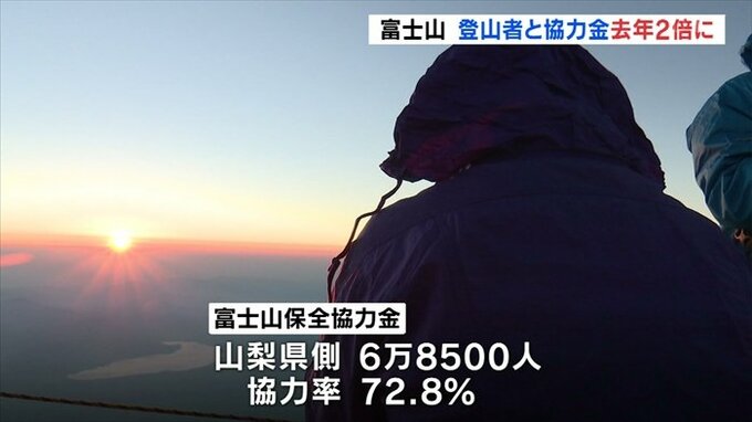 また登山者から任意で1000円を集める富士山保全協力金に協力した人は山梨県側で6万8500人で、金額は6800万円あまりとなりいずれも去年の2倍近く増えました。