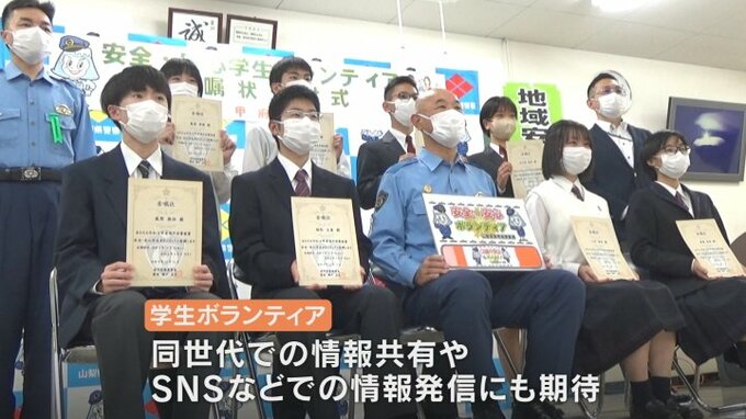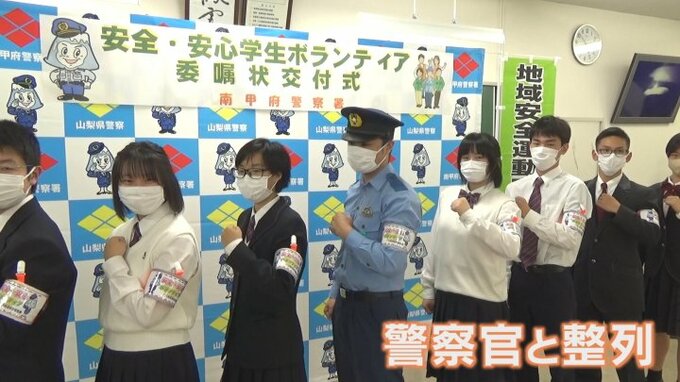 警察官とともに腕章を付けて整列するのは…甲府市内の高校生。