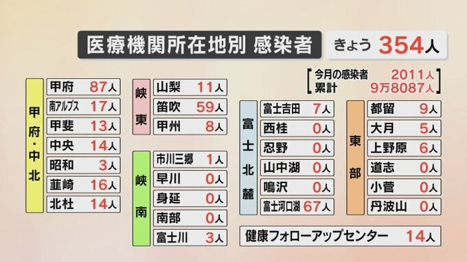 医療機関などの所在地別の感染者は甲府市が87人で最も多く、次いで笛吹市の59人。
