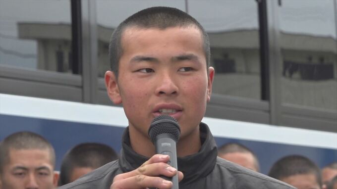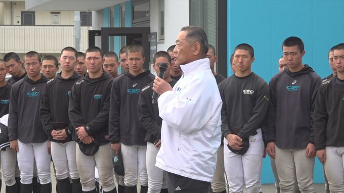 式では教員や保護者がナインを激励し、キャプテンの梅村団選手が甲子園での活躍を誓いました。