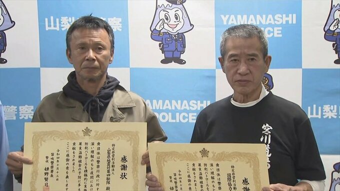 果実盗難防止に貢献したNPO法人2団体に対し感謝状が贈られる 2022年10月14日(金) 11:54 国内 果物盗難の被害防止に貢献したとして県内の2つの団体に警察から感謝状が贈られました。笛吹警察署から感謝状が贈られたのは2つのNPO法人、山梨県地震対策四駆隊と国際協力宮川道場です。2つの団体は6月下旬から3か…