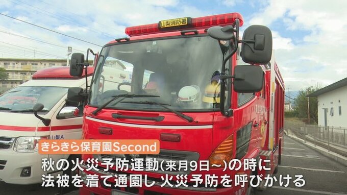 幼年消防クラブは小さい時から火災予防への意識を高めてもらおうと東山梨消防本部が山梨市内の保育園を対象に進めているものです。
