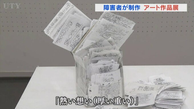 また、同じく知的障害のある男性が制作した「熱い想い(厚い重い)」という作品は文字が書かれた小さなメモを多数集めてオブジェのように見立てています。