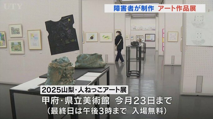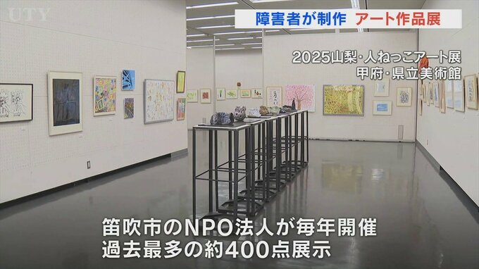 この展示会は笛吹市のNPO法人が2012年から毎年開いているもので、今年は県内外の福祉施設や学校などで制作された絵画や陶芸、オブジェなど過去最も多い約400点が展示されています。
