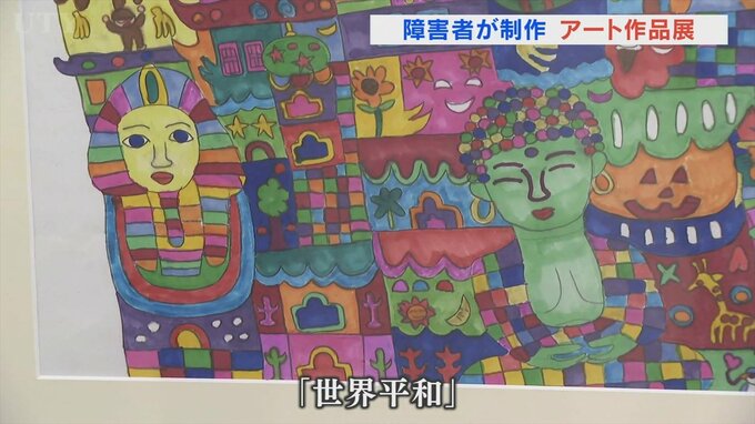 このうち知的障害のある男性が制作した「世界平和」という作品は大仏や自由の女神、スフィンクスなど世界各地の建造物などを色彩豊かに描いた絵画の作品です。