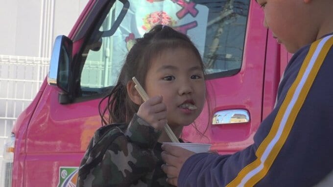 配布対象は地元、大里小学校の1年生と大里地区のひとり親世帯の子どもで、配布場所のコミュニティ施設でさっそく食事を楽しむ子どももいました。
