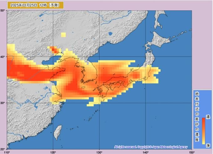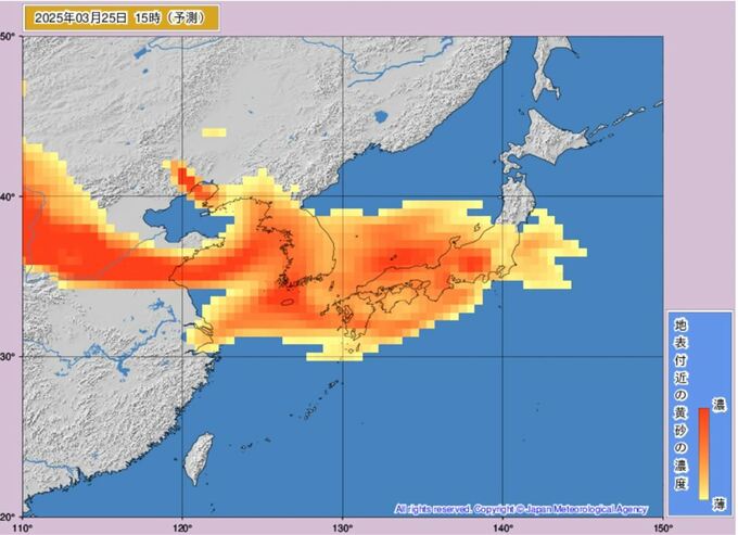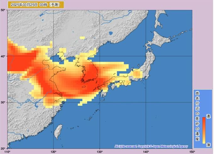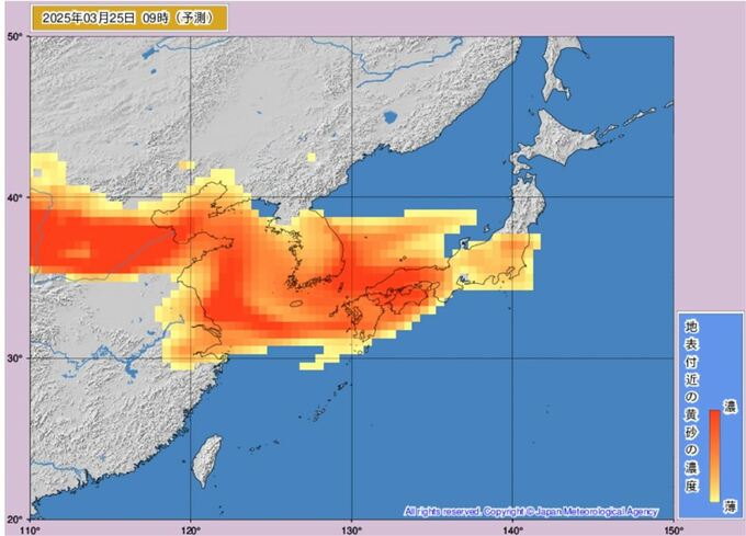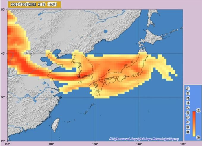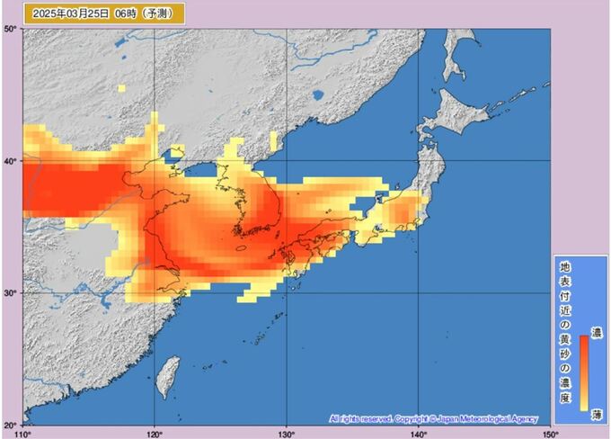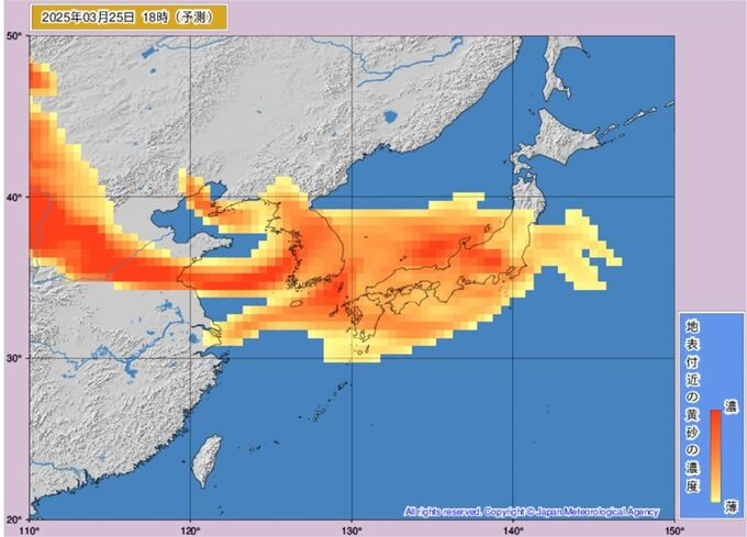 【黄砂の気象情報】25日から26日にかけ、北日本から西日本の広い範囲で黄砂 【いつ・どこで?黄砂の予想シミュレーション】 2025年3月24日(月) 12:10 国内 天気 25日0時 25日3時 25日6時 25日9時 25日12時 25日15時 25日18時 25日21時
