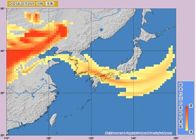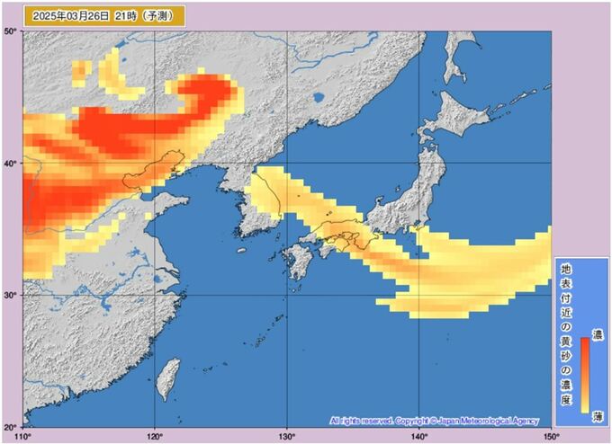 【黄砂の気象情報】25日から26日にかけ、北日本から西日本の広い範囲で黄砂 【いつ・どこで?黄砂の予想シミュレーション】 2025年3月24日(月) 12:10 国内 天気 26日3時 26日9時 26日15時 26日21時