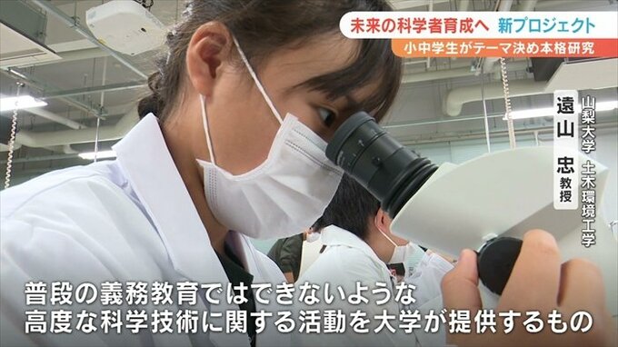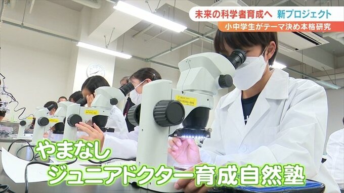 白衣を身にまとい真剣なまなざしで顕微鏡をのぞく子どもたち。小中学生を対象に今年、山梨大学が始めたプロジェクト=やまなしジュニアドクター育成自然塾です。