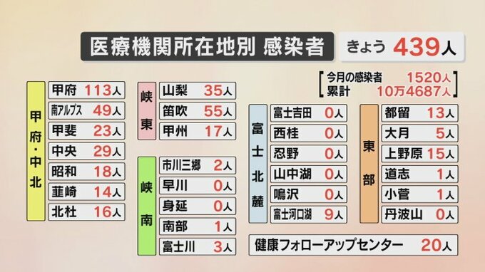 医療機関などの所在地別では甲府市が最も多く113人で、次いで笛吹市が55人などとなっています。