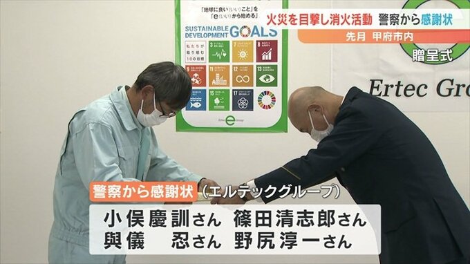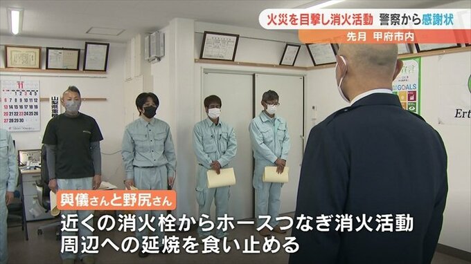 10月、甲府市内で起きた住宅が全焼した火災で消火活動などにあたった近くの会社の従業員らに、警察から感謝状が贈られました。