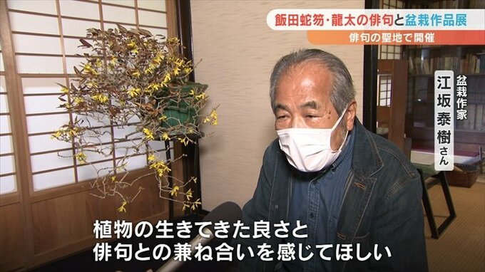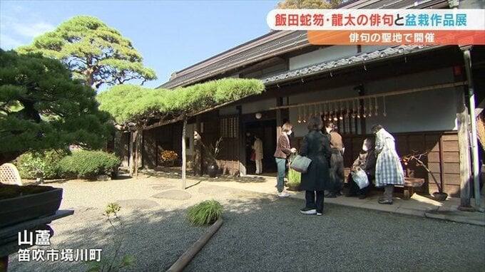 俳句の聖地として知られる笛吹市境川町の「山蘆」です。俳人、飯田蛇笏、龍太親子が生涯を過ごしたこの場所で、「晩秋」を詠んだ2人の俳句と盆栽を組み合わせた作品展が開かれています。