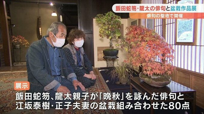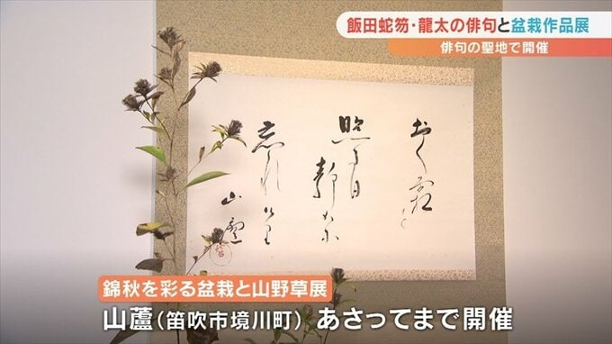 山梨県笛吹市出身の俳人、飯田蛇笏・龍太親子の俳句と秋の盆栽を組み合わせた作品展が笛吹市で開かれています。