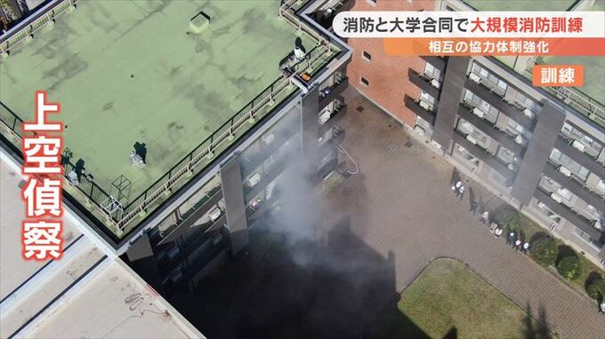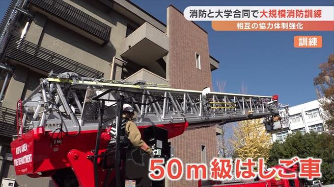 訓練は大学の図書館から火が出たという想定で行われ、ドローンを使った上空からの偵察や、50m級のはしご車での救出などより実践に近いかたちで実施しました。