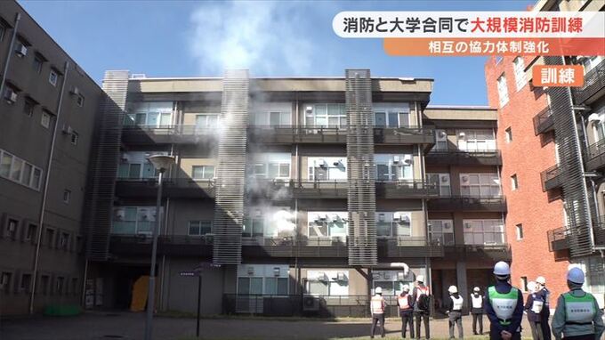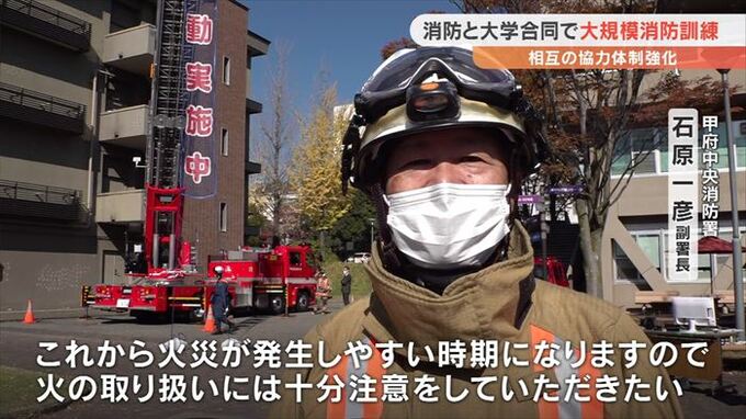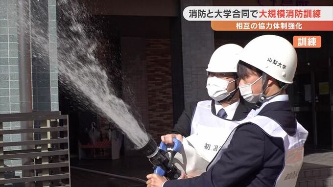 11月9日に始まる秋の全国火災予防運動を前に山梨県内の消防と大学が合同で大規模な消防訓練を行いました。