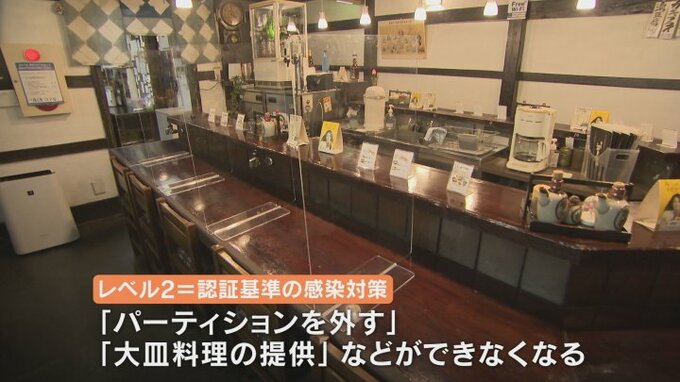 レベル2は「認証基準の感染対策」を指し、「パーティションを外す」ことや「大皿料理の提供」などができなくなります。