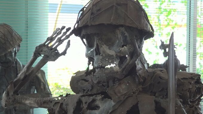 UTY DIG 戦後80年 つなぐ、つながる ‶戦死者からのメッセージ″ 鉄で兵士の身長や装備品など忠実に再現 平和のための戦争展 2025年8月4日(月) 21:05 国内 戦争の悲惨さを訴える造形作家の作品展が山梨市役所で始まりました。故郷を目指し仲間を背負う兵士や、兵士たちの足もとに転がる戦友たちの骨。これらは9年前に80歳で亡くなった造形作家 武田美通さんが「戦死者か…