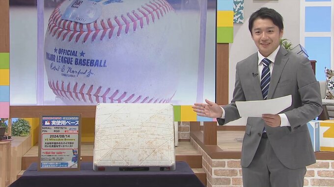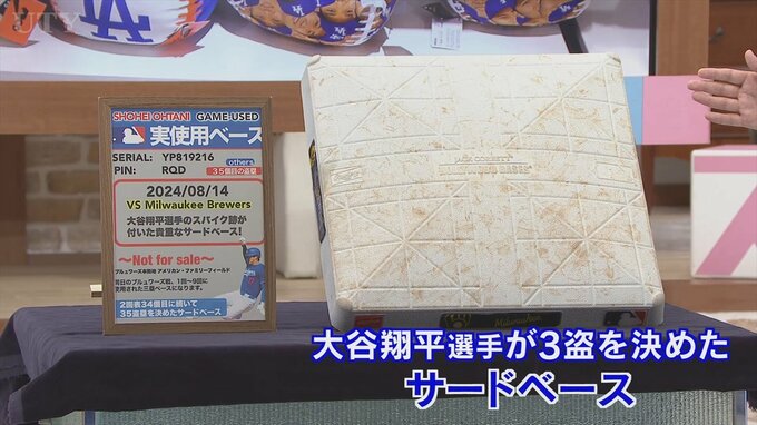 大谷翔平選手が投げた勝利ボール330万円 アメリカの球場にいる気分に メジャーリーグ公式グッズ期間限定ショップ 甲府・岡島 2025年8月6日(水) 20:00 国内 こちら、アメリカメジャーリーグの去年8月14日に行われたドジャーズ対ブリュワーズの試合で実際に使われたベースです。 大谷翔平選手が盗塁を決めた時の3塁ベースなんです。