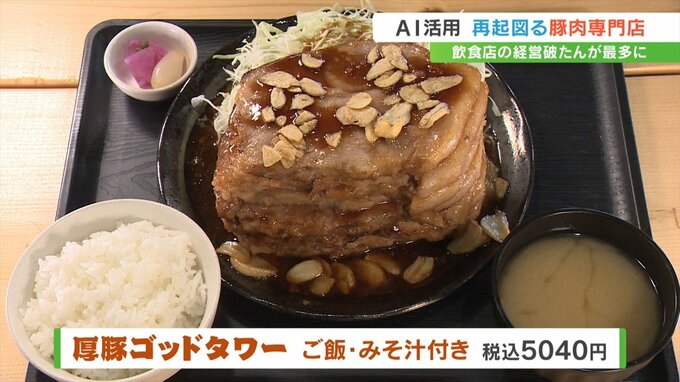 肉汁が滴る厚切り豚肉を豪快に8枚積み重ねた品で、名刺と比べてもこの高さ。ご飯やみそ汁などが付いて総重量約2.5kgで、9分以内に完食できれば無料となるデカ盛りメニューです。