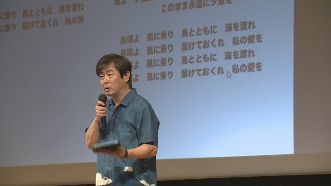 島唄などのヒット曲で知られる元THE BOOMのボーカル宮沢さんは、父親が甲府空襲を経験した話や沖縄を訪れた際にひめゆり学徒隊などから沖縄戦について知り、衝撃を受けたことが島唄を作ったきっかけになったことを話し、実際に島唄も披露しました。
